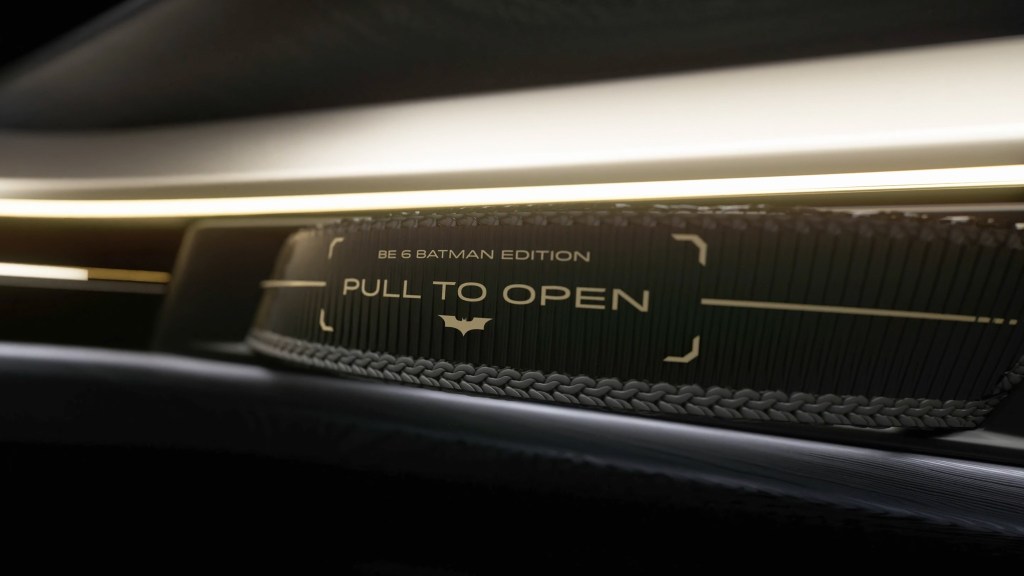 Inside, things lean into cosplay luxury. Charcoal suede and leatherette with gold stitching, embossed Bat logos on the seats, and a special edition plaque on the dash all hammer the point home.